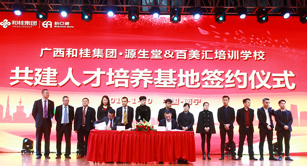 1月20日,源生堂與百美匯培訓學校共建人才培訓基地簽約儀式,在廣西和桂集團2018年年會現場隆重舉行。此次簽約標志著首個中國天然養發人才培養基地的成立。廣西和桂集團總裁黃偉文先生、源生堂執行總經理舒志華女士、百美匯培訓學校校長王勇先生等領導出席本次簽約儀式。中央電視臺、廣西電視臺、南國早報、網易網、中國網、中國經濟時報、新浪新聞、百度新聞等媒體,以及源生堂供應商、加盟商、員工等近千人,共同見證了首個中國天然養發人才基地的簽約儀式。